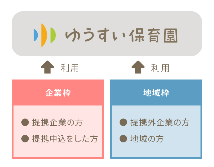 | 利用条件 | ゆうすい保育園の運営元であるヴェゼルワークスとお勤め先の提携(無償)が条件になります。詳しくはお問合せください。 | 条件なし |